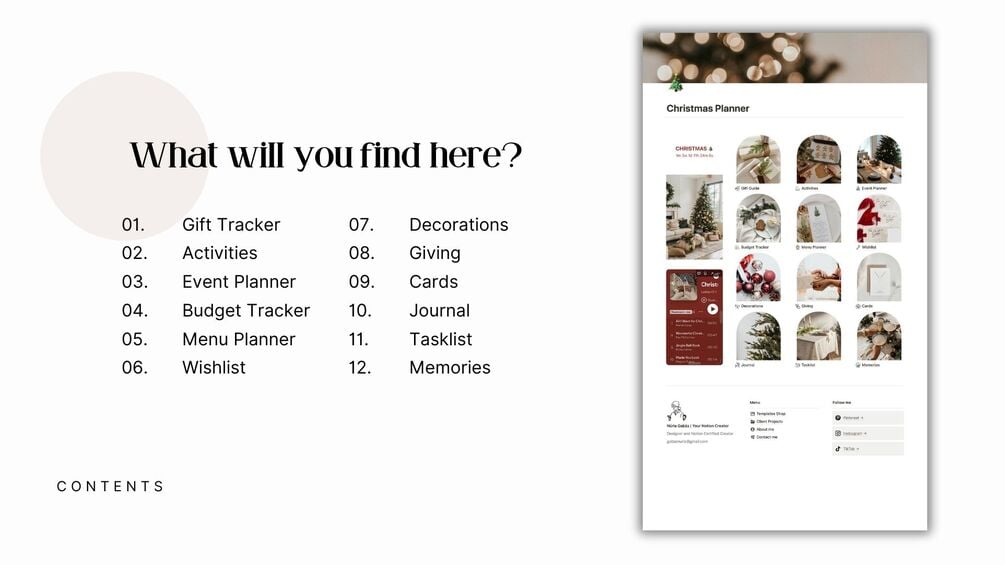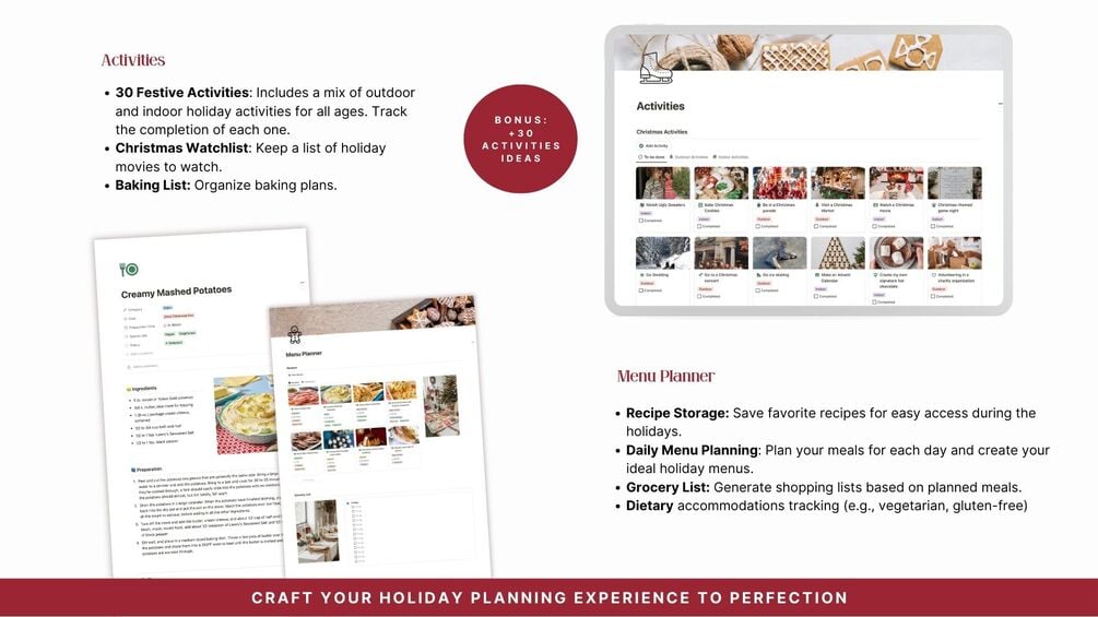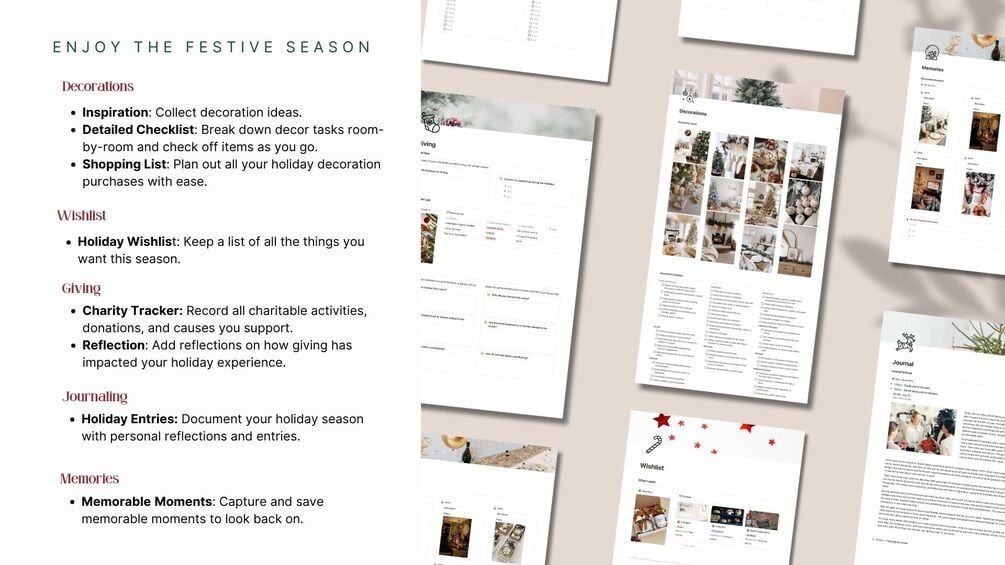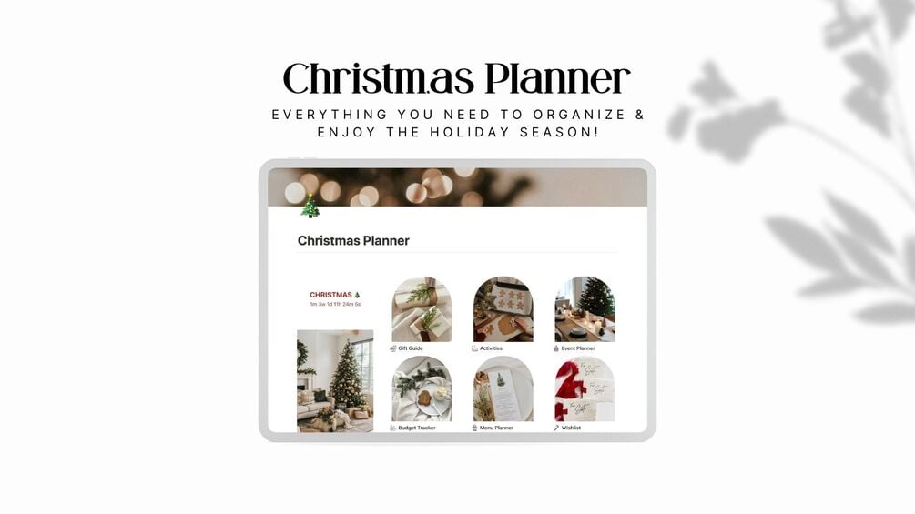 You'll get a fully customizable Notion Christmas Planner Template with pre-built sections for gifts, events, budgets, activities, decor, recipes, and more!